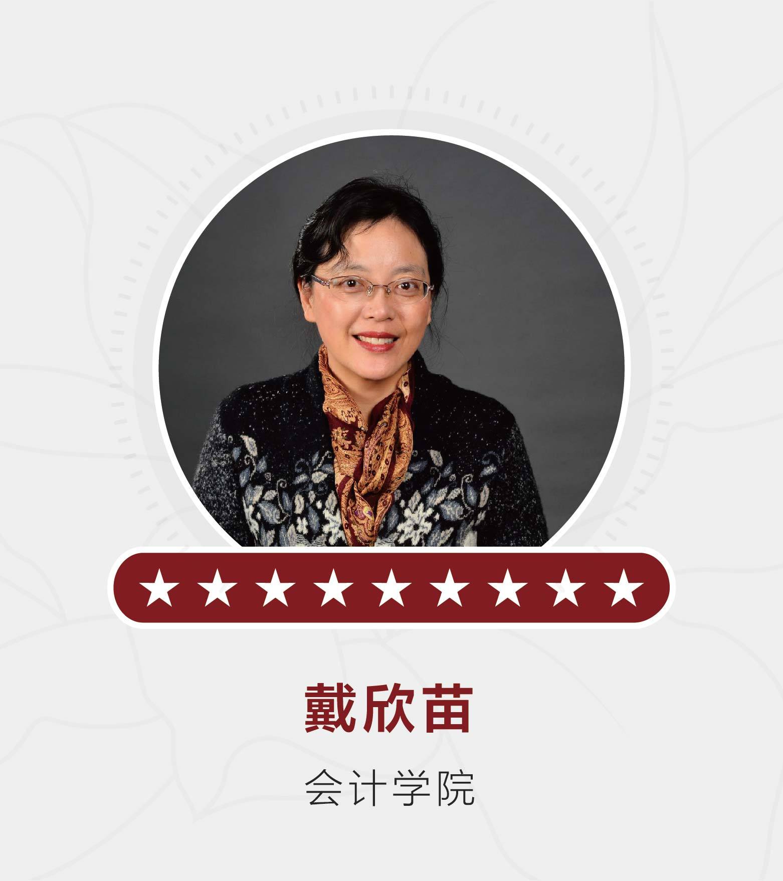 戴欣苗,会计学院副教授、硕士生导师。1984年进校,主要研究领域为财务会计、财务报表分析和会计职业道德,编写的《会计学》、《财务报表分析》等教材获得诸多奖项,《会计学》课程获“国家级精品课程”、“国家级精品资源共享课程”;中外本科生课程《Accounting》获“上海市高校示范性全英语课程”。先后9次入选“我心目中的好老师”。心之所起,一往情深
