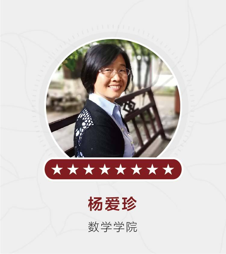 杨爱珍,数学学院副教授,硕士生导师。主要从事《高等数学》的本科教学工作,同时是上海财经大学首批精品课程《高等数学》建设负责人之一,她勤奋求实创新,教学教改成绩突出。曾荣获“三八红旗手”、“教书育人标兵”等荣誉称号,获得2000年度乾隆教学基金优秀教学奖一等奖,先后8次获评“我心目中的好老师”。杨爱珍老师三十年来坚守在教学第一线,她寓育人于教学之中,以教学推进育人。大一新生在入学之初,刚刚脱离了家长的保护和中学教师的严格约束,出现诸多不适,杨老师与学生做朋友,分享自己的亲身经历和体会,帮助他们端正学习态度,勉励他们珍惜四年的大好时光、多学知识、学好知识、打好坚实的基本功,耐心陪伴他们度过适应阶段。